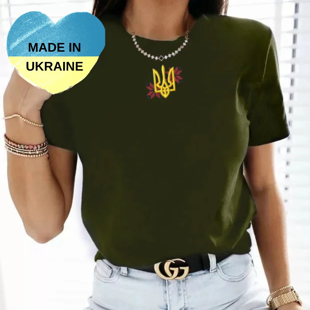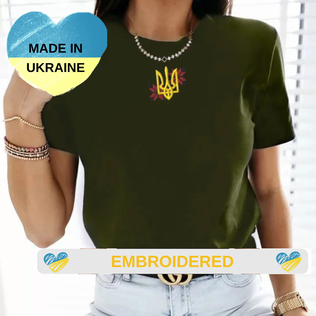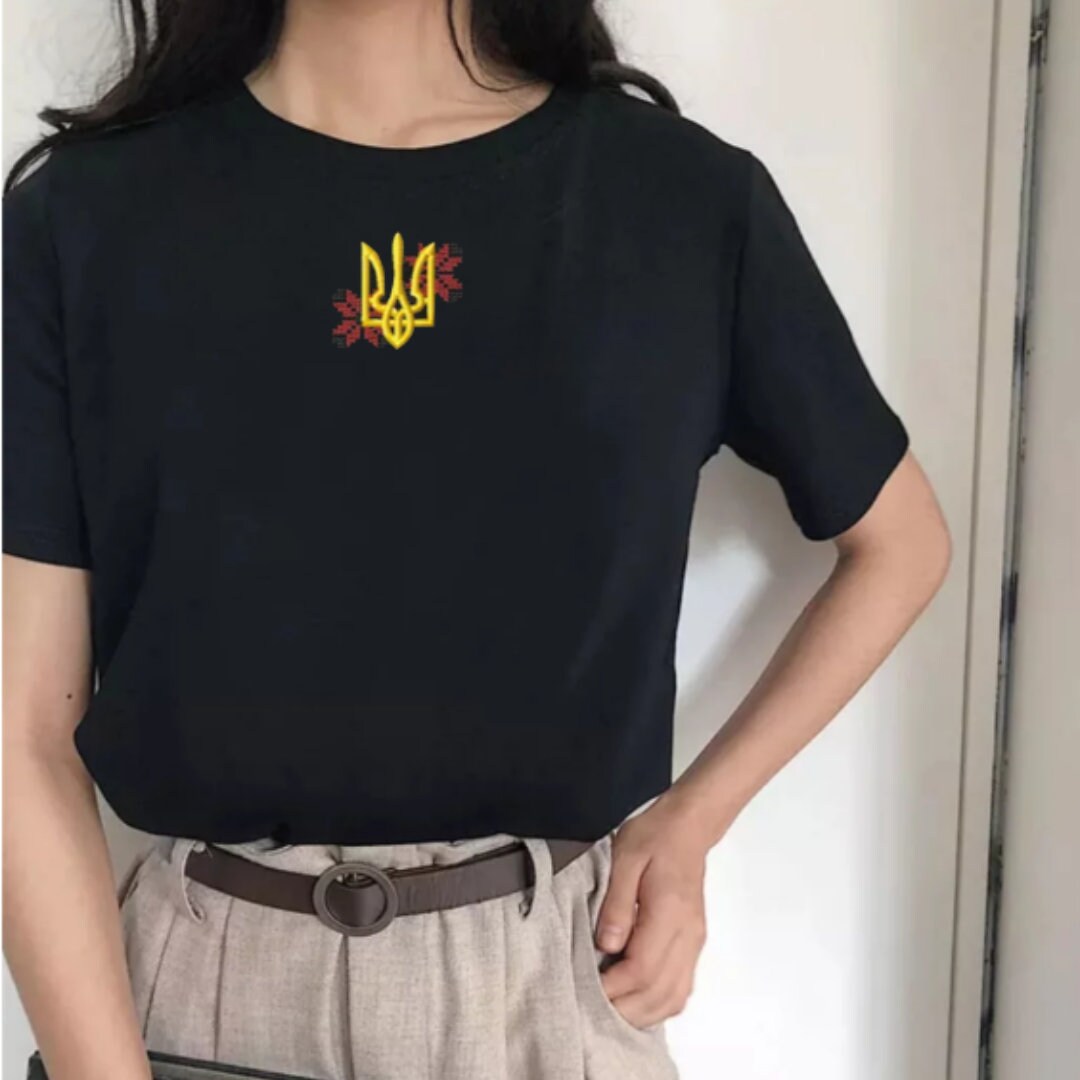 Discover Authentic Ukrainian Style with Our Fashionable Women's Ukrainian T shirt with Embroidery and Coat of Arms. Elevate your fashion game with our exquisite ukrainian t shirt. This unique piece seamlessly blends iconic symbol and modernity, making it the perfect addition to your wardrobe.🌟