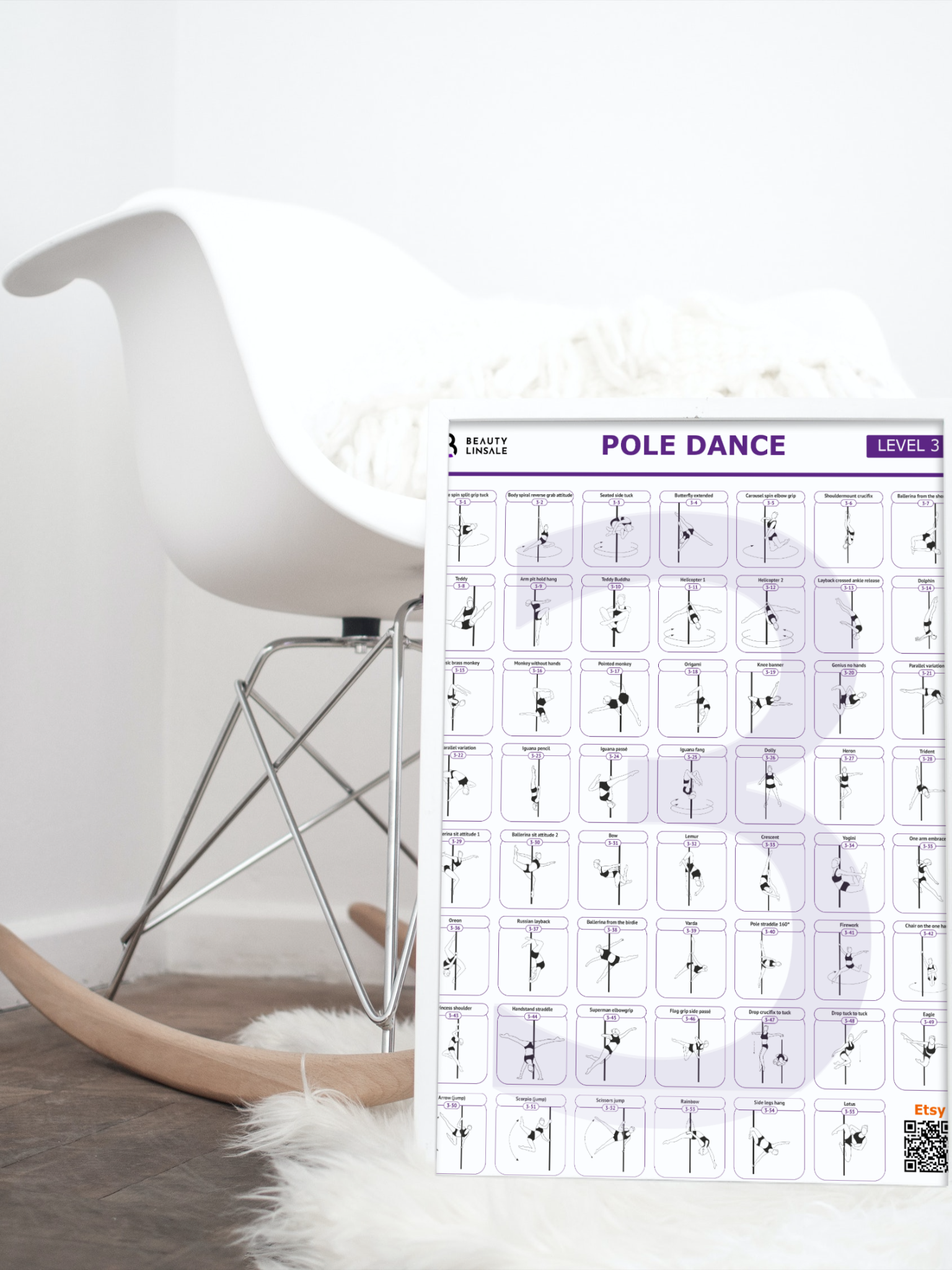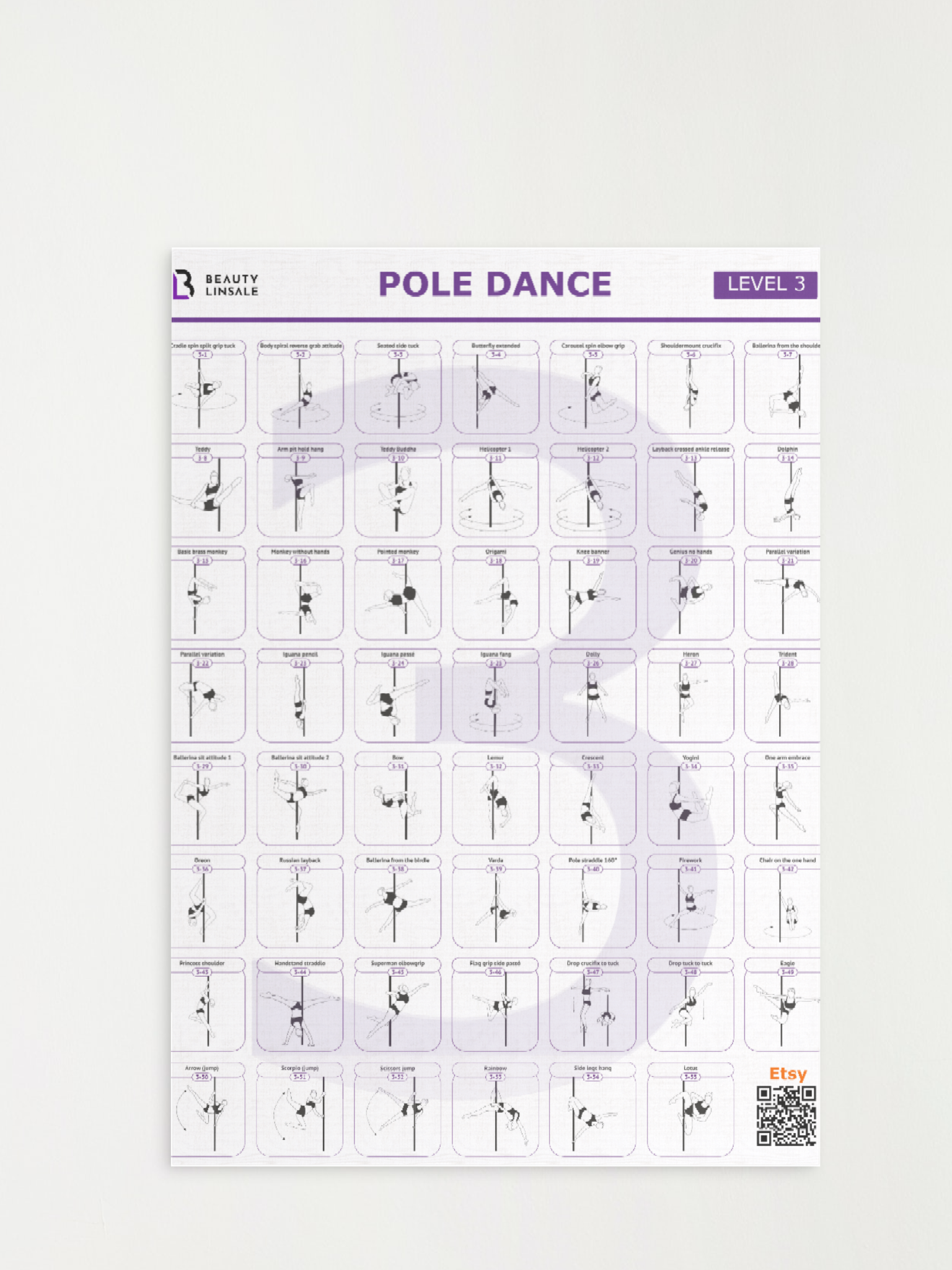 This pole dance poster is more than just a beautiful accent for your space, it is an essential tool for tracking your progress, planning your training, and learning new pole shapes, pole tricks, and pole fitness moves. With this level featuring a variety of pole dance moves and poses, you can easily compose your own pole dancing routines and programs, making them an indispensable resource for both novice and advanced pole dancers.