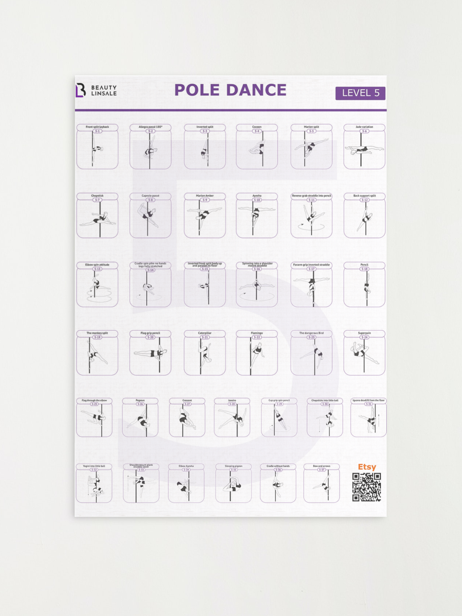 This pole dance poster is more than just a beautiful accent for your space, it is an essential tool for tracking your progress, planning your training, and learning new pole shapes, pole tricks, and pole fitness moves. With this level featuring a variety of pole dance moves and poses, you can easily compose your own pole dancing routines and programs, making them an indispensable resource for both novice and advanced pole dancers.