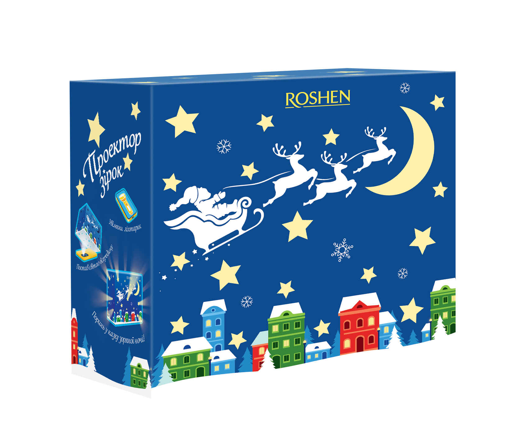 Inside, you’ll find a carefully selected mix of popular Roshen and Tidbit candies — from soft caramel and nougat to chocolate bars and fruity gummies. But the real wonder begins outside the box — the exclusive projector-style packaging transforms into a starry night right in your room!
